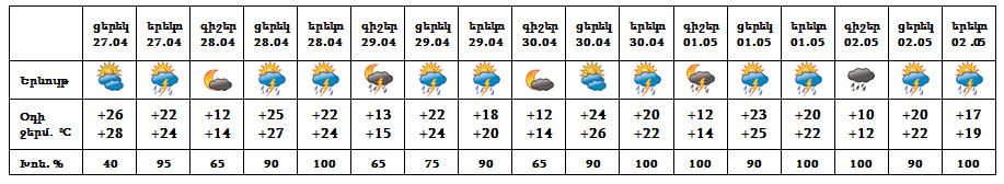 Ապրիլի 27-ի և 30-ի երեկոյան ժամերին քաղաքի առանձին հատվածներում հնարավոր է կարճատև անձրև և ամպրոպ, 28-ի ցերեկը, 29-ին, մայիսի 1-2-ը ժամանակ առ ժամանակ սպասվում է անձրև և ամպրոպ, ամպրոպի ժամանակ քամու ուժգնացում՝ 15-18 մ/վ: Ապրիլի 28-ի և 30-ի գիշերը սպասվում է առանց տեղումների եղանակ: