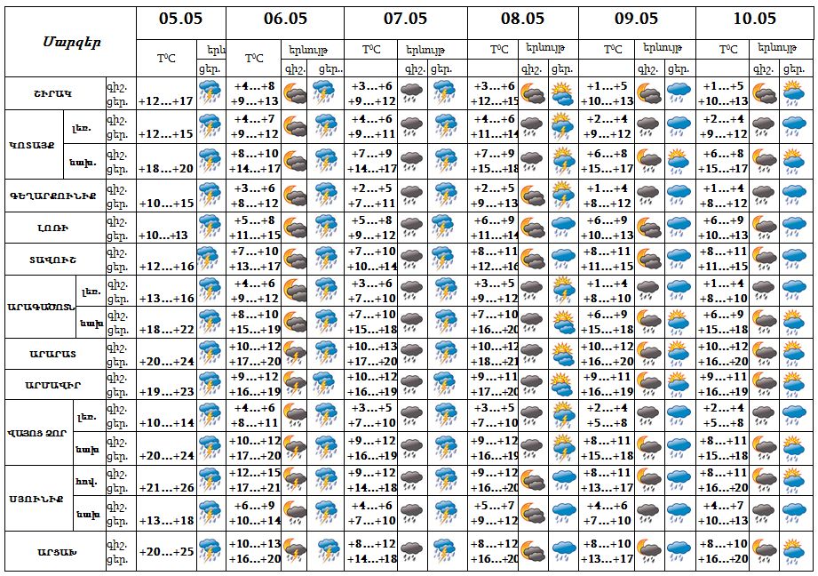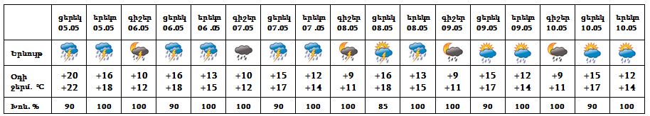 Մայիսի 5-ի ցերեկը, 6-10-ը ժամանակ առ ժամանակ սպասվում է անձրև և ամպրոպ: Ամպրոպի ժամանակ քամու ուժգնացում՝ 15-18 մ/վ: