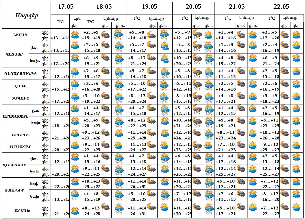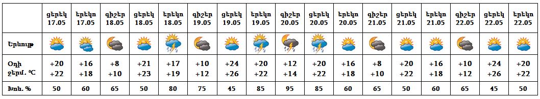 Մայիսի 17-ի ցերեկը, 21-22-ը սպասվում է առանց տեղումների եղանակ: Մայիսի 18-ի երեկոյան ժամերին հնարավոր է, 19-ի երեկոյան ժամերին, 20-ին սպասվում է կարճատև անձրև և ամպրոպ, ամպրոպի ժամանակ քամու ուժգնացում՝ 15-18 մ/վ: