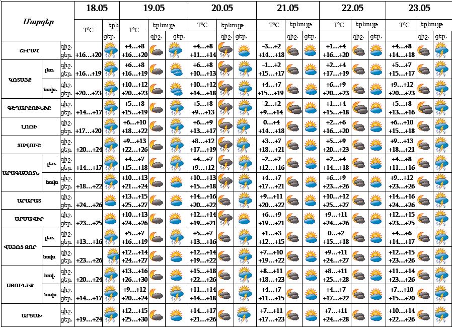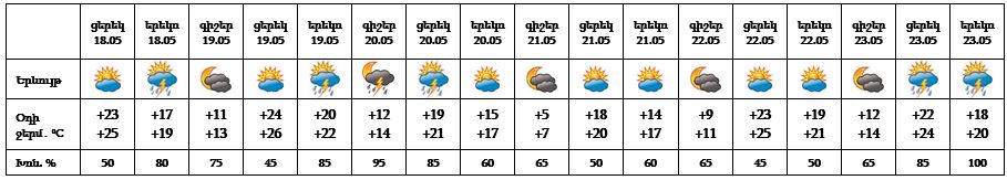 Մայիսի 18-ի երեկոյան ժամերին հնարավոր է, 19-ի երեկոյան ժամերին, 20-ի գիշերը և կեսօրից հետո, 23-ի կեսօրից հետո սպասվում է կարճատև անձրև և ամպրոպ, ամպրոպի ժամանակ` քամու ուժգնացում՝ 15-18 մ/վ: Մայիսի 21-22-ը սպասվում է առանց տեղումների եղանակ: