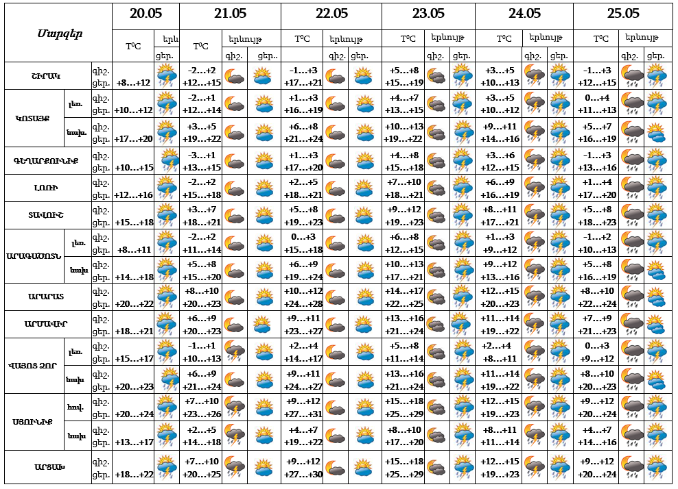 Մայիսի 20-ի կեսօրից հետո շրջանների զգալի մասում, 21-ի գիշերը Սյունիքում և Արցախում սպասվում է անձրև և ամպրոպ, բարձր լեռնային առանձին գոտիներում երեկոյան ժամերին սպասվում է թաց ձյուն։ Մայիսի 21-ի ցերեկը, 22-ին սպասվում է առանց տեղումների եղանակ: Մայիսի 23-ի կեսօրից հետո, 24-25-ը գիշերը և կեսօրից հետո շրջանների զգալի մասում սպասվում է անձրև և ամպրոպ: Առանձին հատվածներում հնարավոր է նաև կարկուտ: