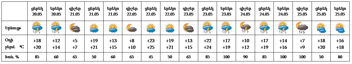Մայիսի 20-ի կեսօրից հետո, 23-ի ցերեկը, 24-ին, 25-ի գիշերը ժամանակ առ ժամանակ սպասվում է անձրև և ամպրոպ, ամպրոպի ժամանակ՝ քամու ուժգնացում՝ 15-18 մ/վ: Մայիսի 21-22-ը, 23-ի գիշերը, 25-ի ցերեկը սպասվում է առանց տեղումների եղանակ: