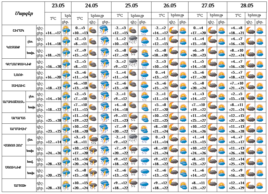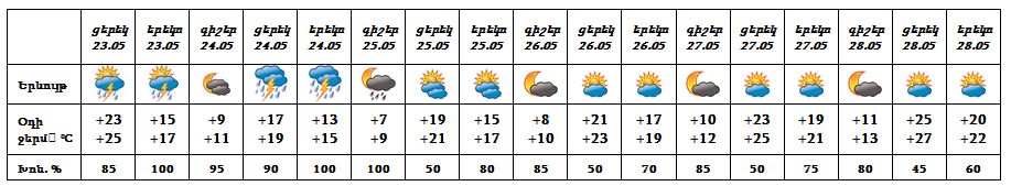 Մայիսի 23-ի ցերեկը, 24-ին, 25-ի գիշերը ժամանակ առ ժամանակ սպասվում է անձրև և ամպրոպ, ամպրոպի ժամանակ քամու ուժգնացում՝ 15-18 մ/վ: Մայիսի 25-ի ցերեկը, 26-28-ը սպասվում է առանց տեղումների եղանակ: