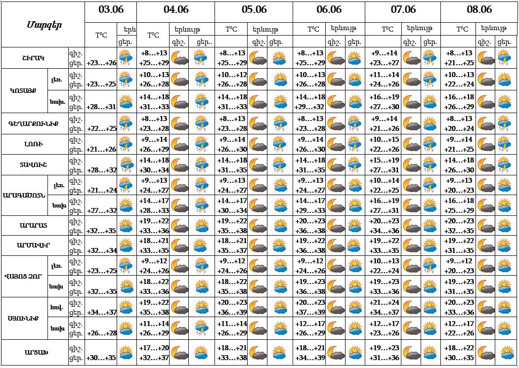Հունիսի 3-8-ի կեսօրից հետո առանձին շրջաններում սպասվում է կարճատև անձրև և ամպրոպ: Առանձին հատվածներում սպասվում է նաև կարկուտ: