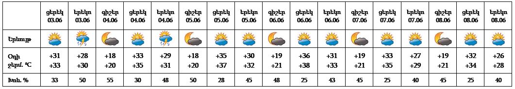 Հունիսի 3-4-ի երեկոյան ժամերին քաղաքի առանձին հատվածներում հնարավոր է կարճատև անձրև և ամպրոպ, ամպրոպի ժամանակ հնարավոր է քամու ուժգնացում՝ 15-18 մ/վ արագությամբ: Հունիսի 5-8-ը սպասվում է առանց տեղումների եղանակ։