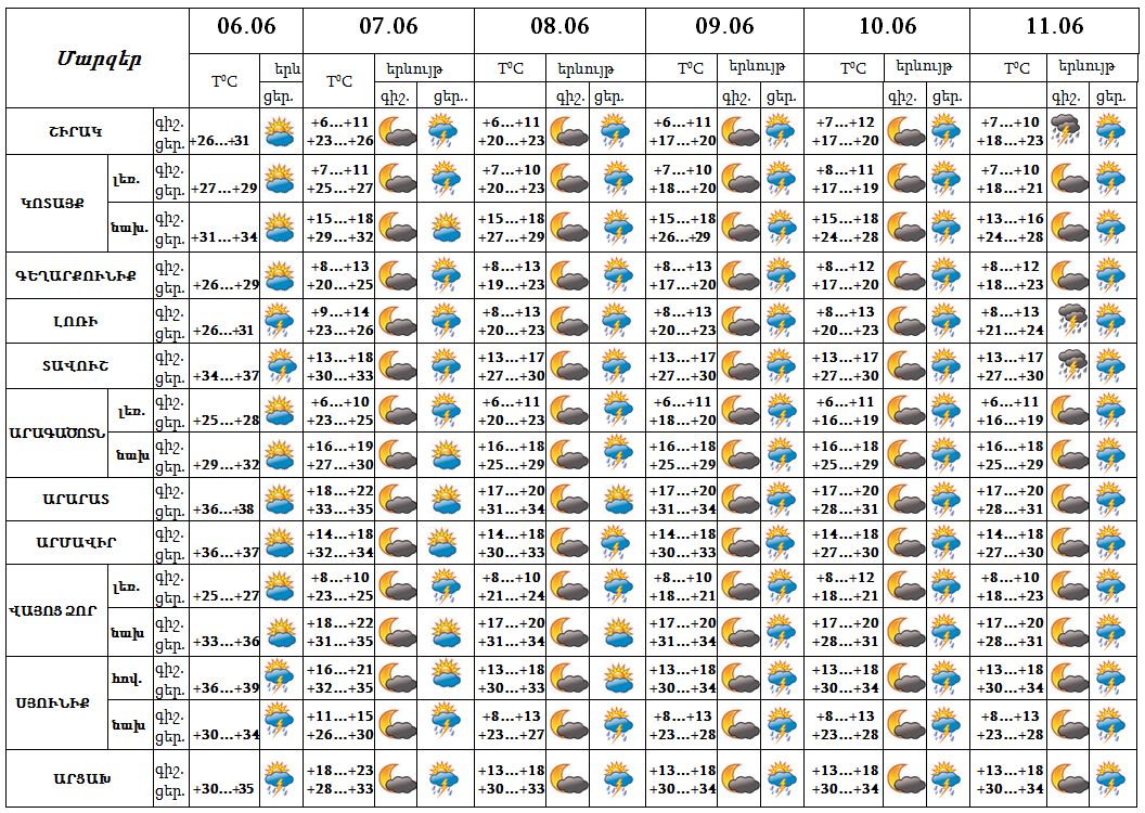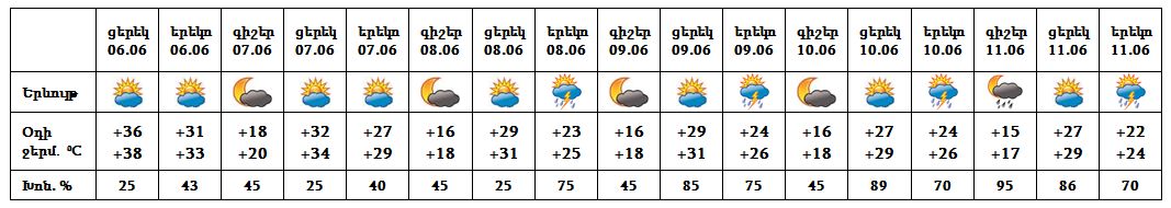 Օդի ջերմաստիճանը հունիսի 6-ի ցերեկը կբարձրանա ևս 1-2 աստիճանով, հունիսի 7-9-ն աստիճանաբար կնվազի 6-8 աստիճանով: