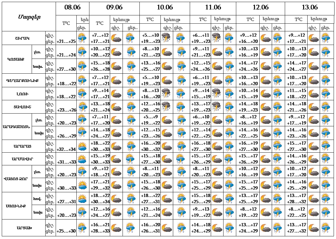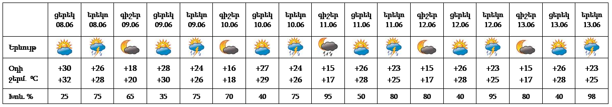 Հունիսի 8-ի երեկոյան ժամերին, 9-13-ը գիշերը և երեկոյան ժամերին սպասվում է կարճատև անձրև և ամպրոպ, ամպրոպի ժամանակ սպասվում է նաև քամու ուժգնացում՝ 18-20մ/վ արագությամբ: