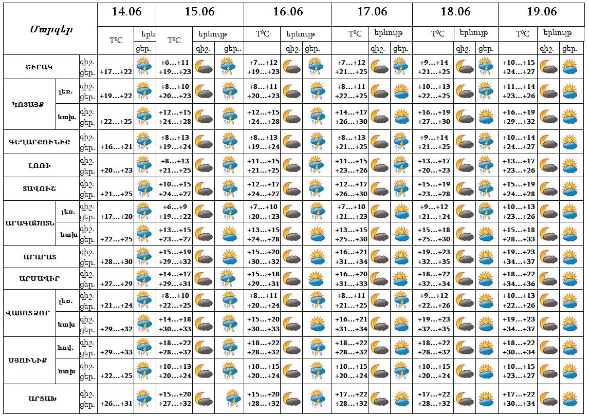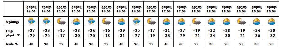 Հունիսի 14-ի կեսօրից հետո, 15-16-ը շրջանների զգալի մասում, 17-18-ի գիշերը և կեսօրից հետո առանձին շրջաններում սպասվում է կարճատև անձրև և ամպրոպ: Առանձին հատվածներում սպասվում է նաև կարկուտ: Հունիսի 19-ին սպասվում է առանց տեղումների եղանակ: