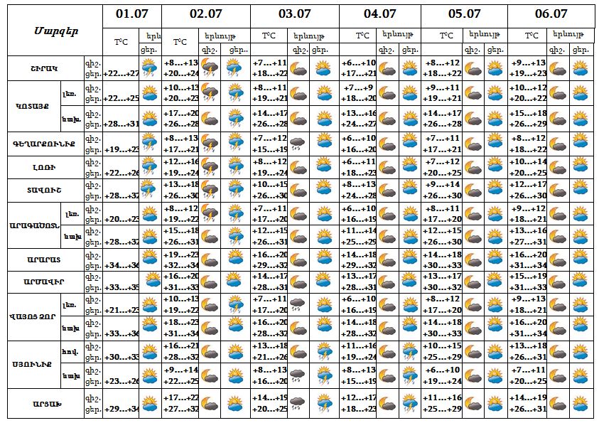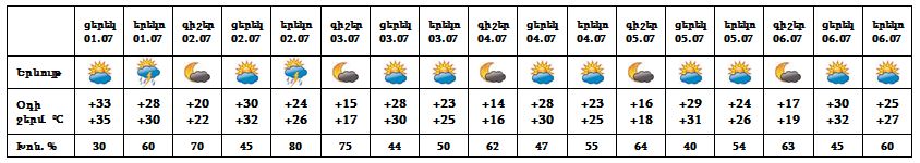 Օդի ջերմաստիճանը հուլիսի 2-4-ն աստիճանաբար կնվազի 3-5 աստիճանով, Սյունքիում և Արցախում` 8-10 աստիճանով:
