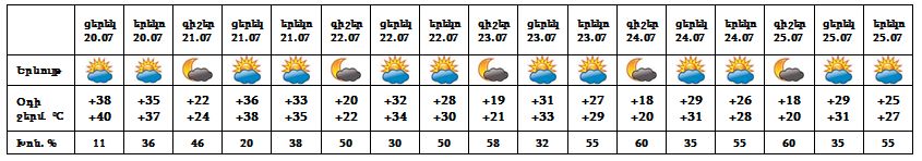 Հուլիսի 20-ի ցերեկը, 21-25-ը սպասվում է առանց տեղումների եղանակ: Երեկոյան ժամերին սպասվում է քամու ուժգնացում՝ 13-16 մ/վ արագությամբ: