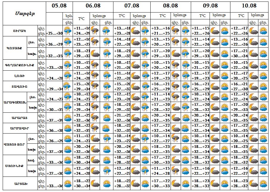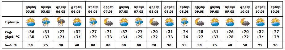 Օգոստոսի 5-8-ի երեկոյան ժամերին և գիշերը քաղաքի առանձին հատվածներում հնարավոր է կարճատև անձրև և ամպրոպ։ Oգոստոսի 9-10-ը սպասվում է առանց տեղումների եղանակ: Երեկոյան ժամերին և ամպրոպի ժամանակ սպասվում է քամու ուժգնացում՝ 15-20 մ/վ արագությամբ: