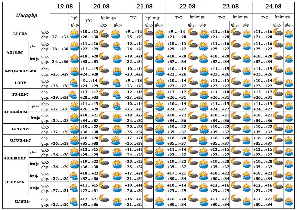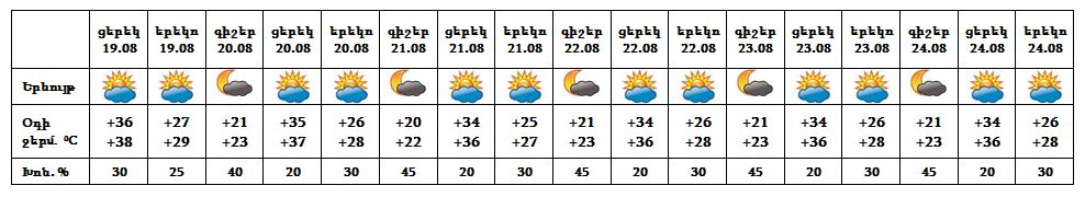 Օգոստոսի 19-ի ցերեկը, 20-24- ը, սպասվում է առանց տեղումների եղանակ: Երեկոյան ժամերին սպասվում է քամու ուժգնացում` 13-15 մ/վ: