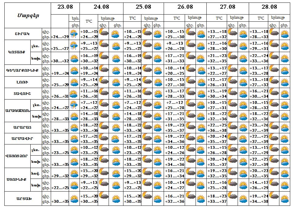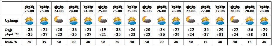 Օգոստոսի 23-ի ցերեկը, 24-28-ը սպասվում է առանց տեղումների եղանակ: Օգոստոսի 23-25-ի երեկոյան ժամերին սպասվում է քամու ուժգնացում` 13-15 մ/վ:
