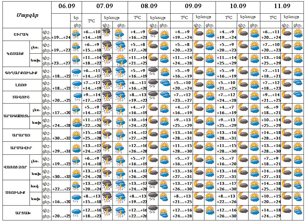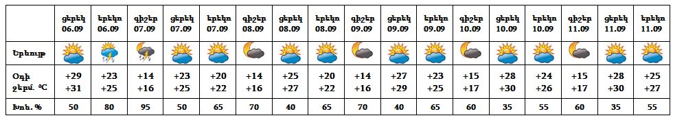 Սեպտեմբերի 6-ի ցերեկը, 8-11-ը սպասվում է առանց տեղումների եղանակ: Սեպտեմբերի 6-ի երեկոյան ժամերին, 7-ի գիշերը և առավոտյան սպասվում է անձրև և ամպրոպ, ամպրոպի ժամանակ սպասվում է քամու ուժգնացում` 15-19 մ/վ: