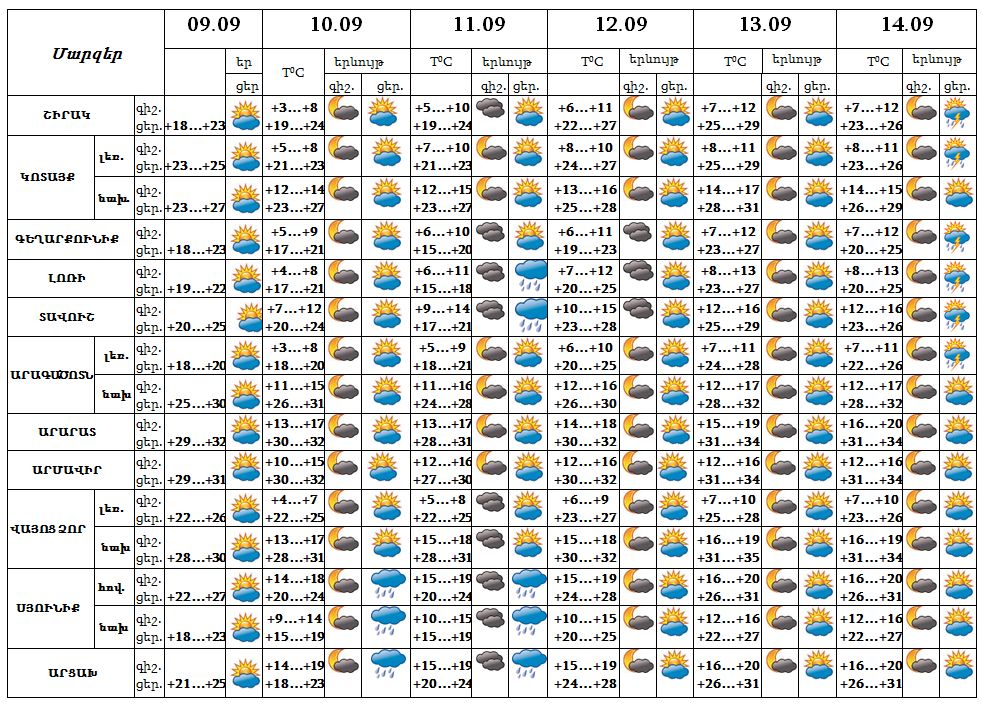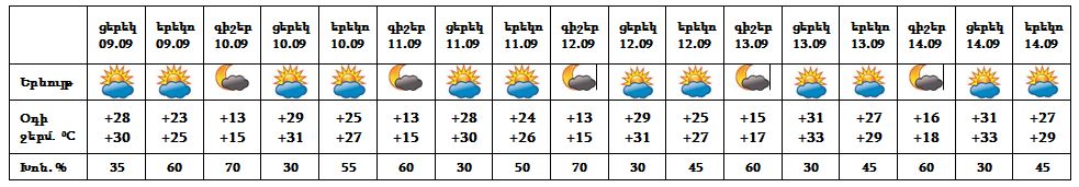 Սեպտեմբերի 9-ի ցերեկը, 12-13-ը սպասվում է առանց տեղումների եղանակ: Սեպտեմբերի 10-ի ցերեկը, 11-ին, 14-ի ցերեկն առանձին շրջաններում սպասվում է անձրև, 14-ին նաև ամպրոպ: