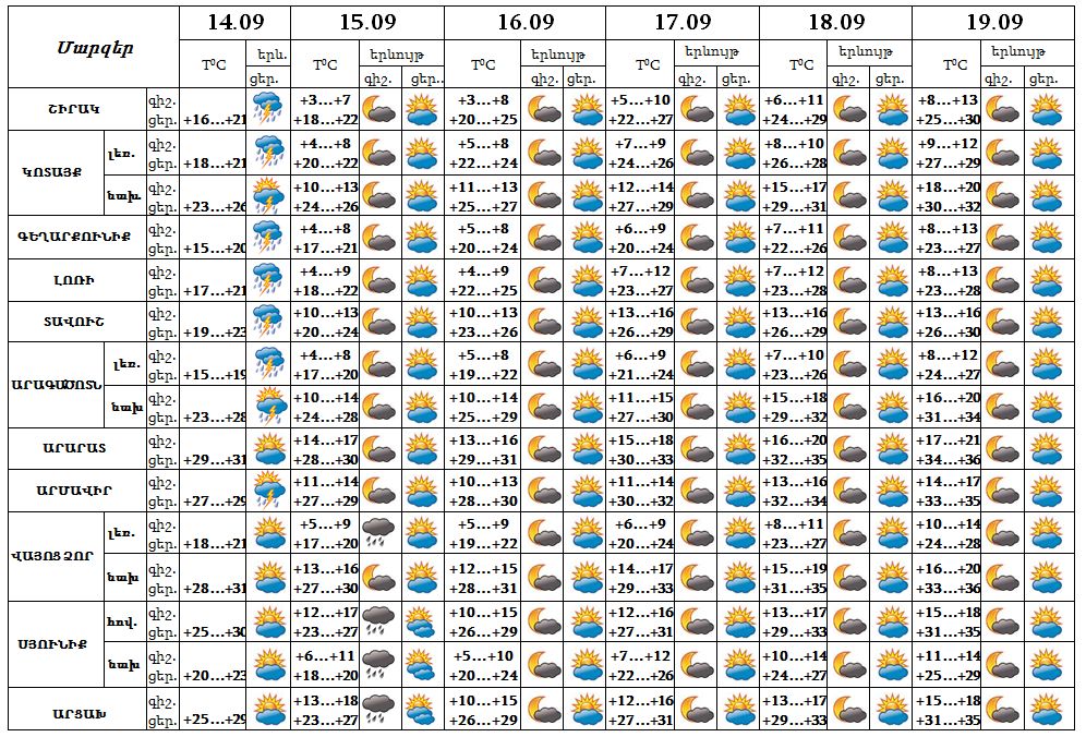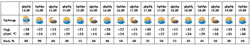 Սեպտեմբերի 14-ի ցերեկը, 15-ի գիշերն առանձին շրջաններում սպասվում է անձրև, 14-ի ցերեկը նաև ամպրոպ: Սեպտեմբերի 15-ի ցերեկը, 16-19-ը սպասվում է առանց տեղումների եղանակ: