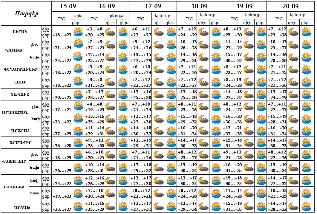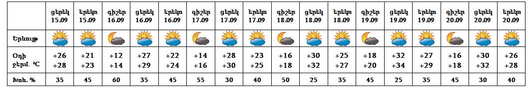 Սեպտեմբերի 15-ի ցերեկը, 16-20-ը սպասվում է առանց տեղումների եղանակ: