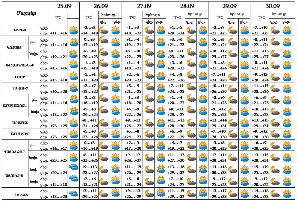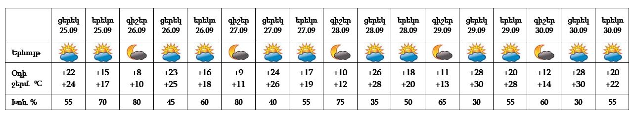 Սեպտեմբերի 25-ի ցերեկը, 26-30-ը սպասվում է առանց տեղումների եղանակ: