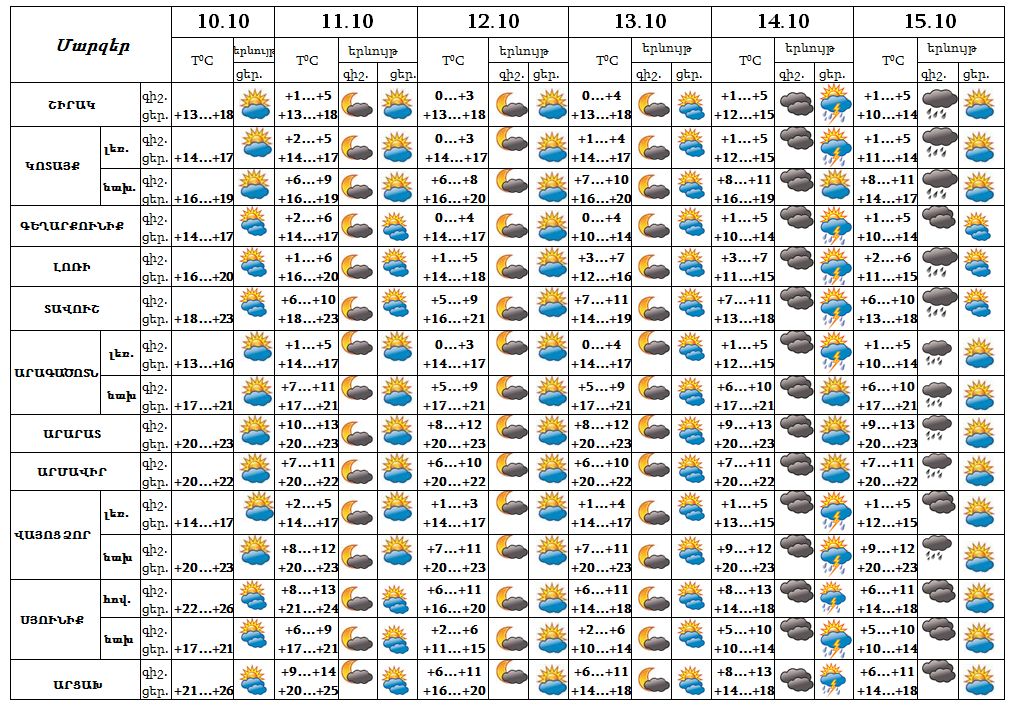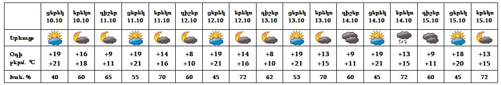 Օդի ջերմաստիճանը հոկտեմբերի 10-ի ցերեկը կբարձրանա 4-6 աստիճանով, 11-12-ի գիշերը աստիճանաբար կնվազի 3-5 աստիճանով: