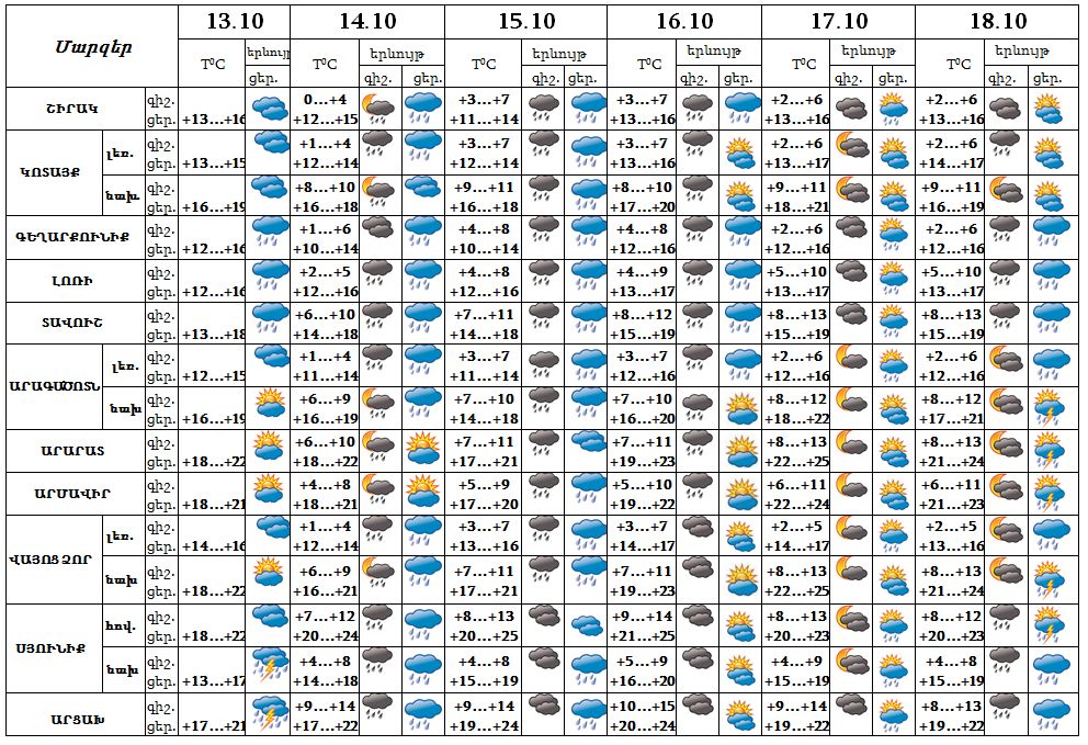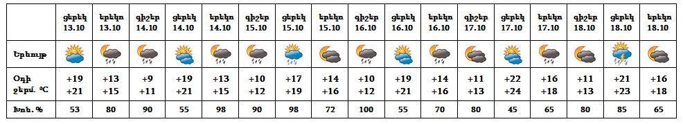Հոկտեմբերի 13-ի ցերեկը, 14-18-ն առանձին շրջաններում սպասվում է անձրև, 13-ի և 18-ի ցերեկը հնարավոր է նաև ամպրոպ: