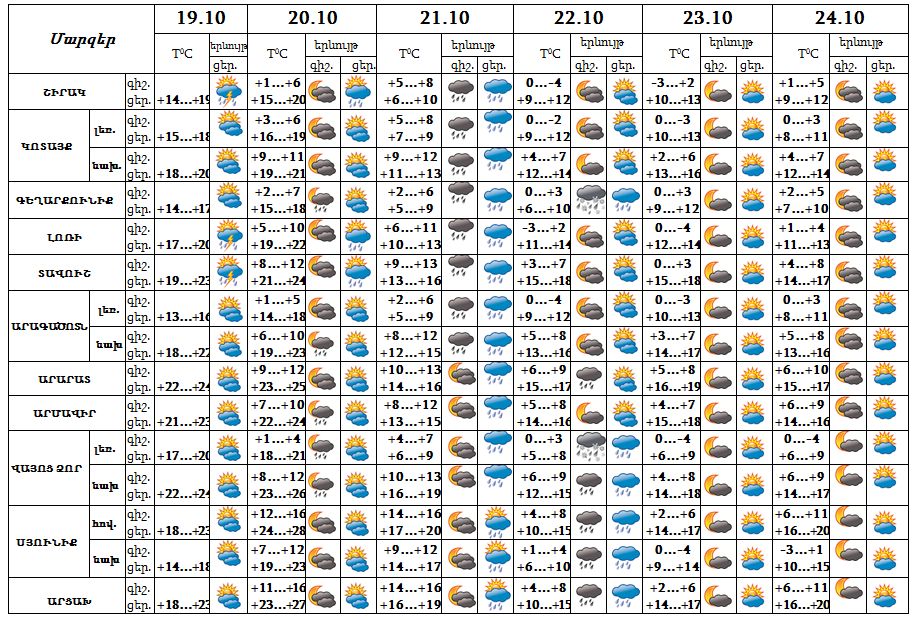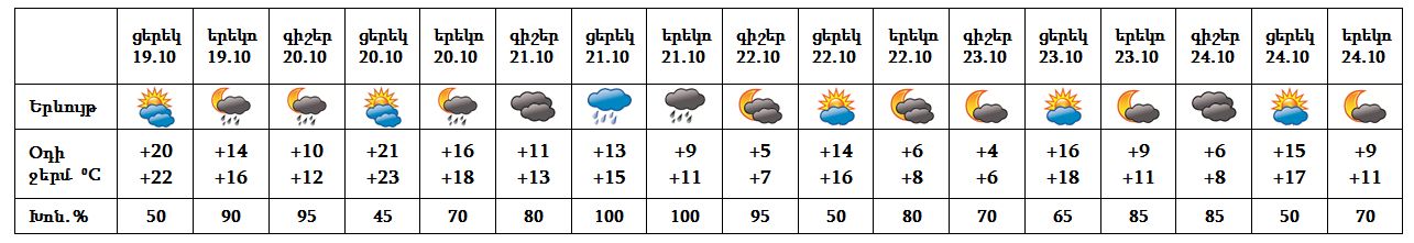 Հոկտեմբերի 19-ի երեկոյան ժամերին, 20-ի գիշերը և երեկոյան հնարավոր է կարճատև անձրև։ Հոկտեմբերի 21-ին սպասվում է անձրև: Հոկտեմբերի 22-24-ը սպասվում է առանց տեղումների եղանակ: