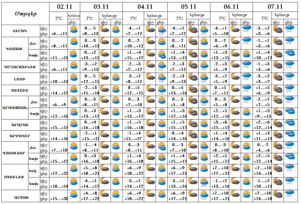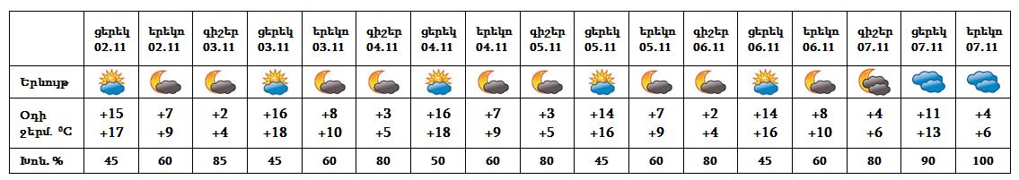Նոյեմբերի 2-ի ցերեկը, 3-ին սպասվում է առանց տեղումների եղանակ: Նոյեմբերի 4-7-ն առանձին շրջաններում սպասվում են թույլ տեղումներ: