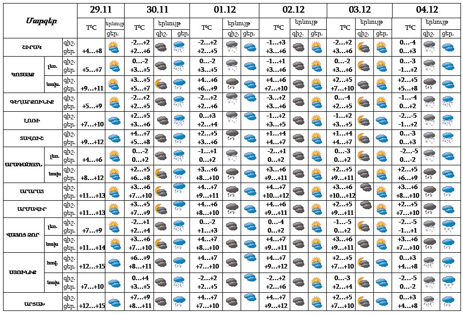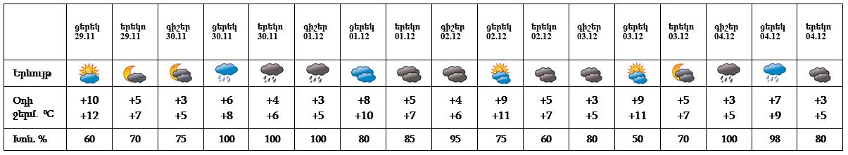Նոյեմբերի 29-ի ցերեկը, 30-ի գիշերը, դեկտեմբերի 1-ի ցերեկը, 2-3-ը սպասվում է առանց տեղումների եղանակ: Նոյեմբերի 30-ի ցերեկը, դեկտեմբերի 1-ի գիշերը, 4-ին սպասվում է անձրև: