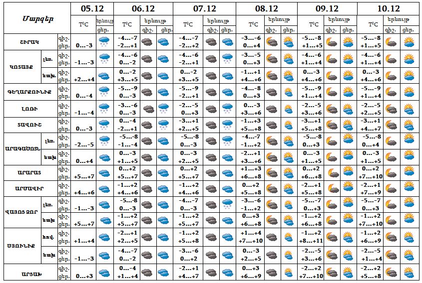 Դեկտեմբերի 5-ի ցերեկը, 6-7-ն առանձին շրջաններում սպասվում է թույլ ձյուն և մառախուղ: Դեկտեմբերի 8-10-ը սպասվում է առանց տեղումների եղանակ: