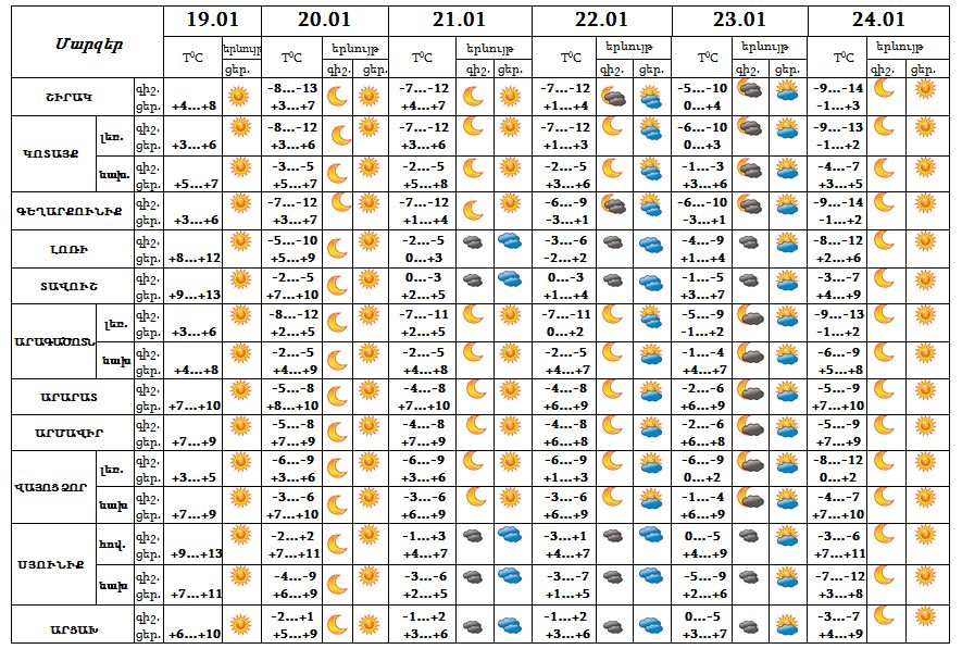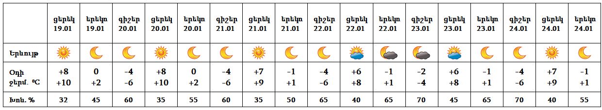 Հունվարի 19-ի ցերեկը, 20-24-ը սպասվում է առանց տեղումների եղանակ: