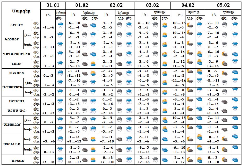 Հունվարի 31-ի ցերեկը, փետրվարի 1-ին, 4-ի ցերեկը, 5-ին առանձին շրջաններում, 2-ին, 3-ի գիշերը շրջանների մեծ մասում ժամանակ առ ժամանակ սպասվում է ձյուն և մառախուղ։ Փետրվարի 3-ի ցերեկը, 4-ի գիշերը սպասվում է առանց տեղումների եղանակ։