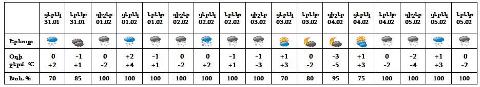 Հունվարի 31-ի ցերեկը, փետրվարի 1-ին, 4-ի երեկոյան ժամերին, 5-ին սպասվում է թույլ ձյուն։ Փետրվարի 2-ին, 3-ի գիշերը ժամանակ առ ժամանակ սպասվում է ձյուն և մառախուղ: Փետրվարի 3-ի ցերեկը, 4-ի գիշերը սպասվում է առանց տեղումների եղանակ։