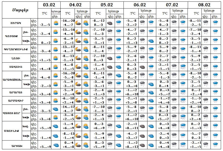 Օդի ջերմաստիճանը փետրվարի 4-ի գիշերը կնվազի 5-8 աստիճանով, 5-6-ի գիշերը նույնքանով կբարձրանա:
