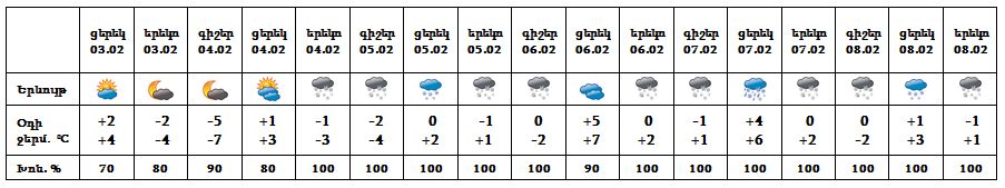 Փետրվարի 3-ի ցերեկը, 4-ի գիշերը սպասվում է առանց տեղումների եղանակ։ Փետրվարի 4-ի երեկոյան ժամերին, 5-6-ն առանձին շրջաններում, 7-8-ը շրջանների մեծ մասում սպասվում է ձյուն և մառախուղ, լեռնային շրջաններում՝ բուք, ցածր հորիզոնական տեսանելիություն։ Փետրվարի 6-7-ի ցերեկը հանրապետության հովտային գոտում տեղումները սպասվում են ձնախառն անձրևի տեսքով։