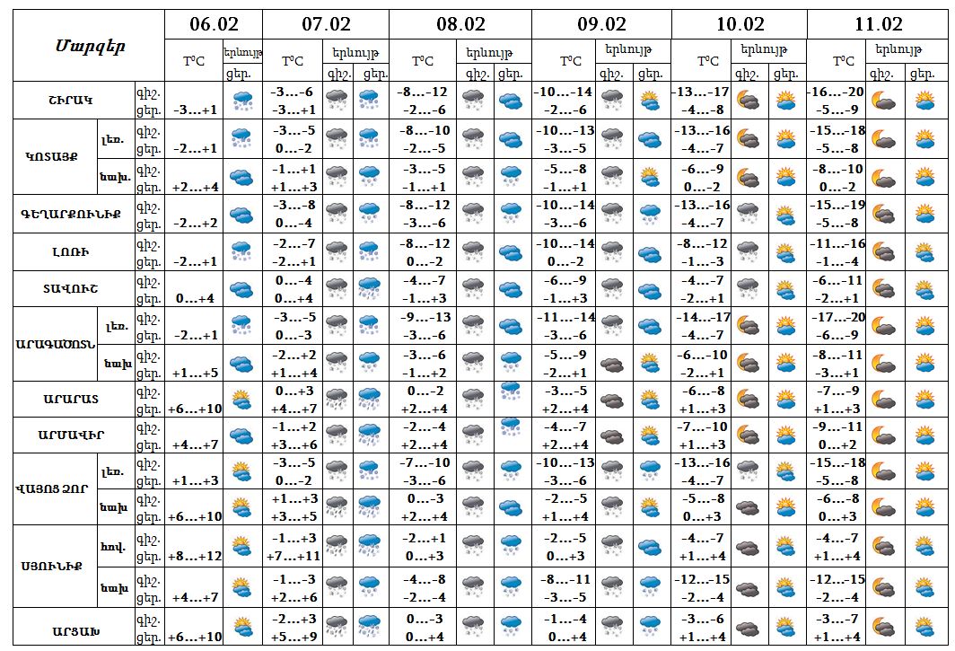 Փետրվարի 6-ի և 8-ի ցերեկը, 9-ին, 10-ի գիշերն առանձին շրջաններում, 7-ին, 8-ի գիշերը շրջանների մեծ մասում սպասվում է ձյուն և մառախուղ, լեռնային շրջաններում՝ բուք, ցածր հորիզոնական տեսանելիություն։ Փետրվարի 6-ի ուշ երեկոյան ժամերին, 7-ին հանրապետության հովտային գոտում տեղումները սպասվում են ձնախառն անձրևի տեսքով։ Փետրվարի 10-ի ցերեկը, 11-ին սպասվում է առանց տեղումների եղանակ: