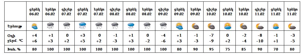 Փետրվարի 6-ի երեկոյան ժամերին, 7-ին սպասվում է թաց ձյուն և ձնախառն անձրև։ Փետրվարի 8-ին, 9-ի գիշերը սպասվում է ձյուն և մառախուղ: Փետրվարի 9-ի ցերեկը, 10-11-ը սպասվում է առանց տեղումների եղանակ։ Փետրվարի 6-ին սպասվում է քամու ուժգնացում` 12-15 մ/վ։