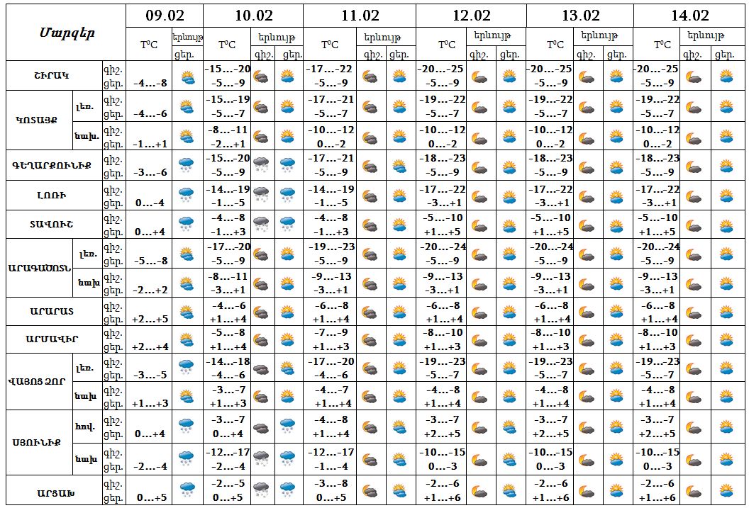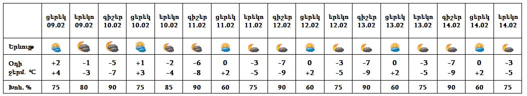 Փետրվարի 9-ի ցերեկը, 10-ին առանձին շրջաններում սպասվում է թույլ ձյուն և մառախուղ։ Փետրվարի 11-14-ը սպասվում է առանց տեղումների եղանակ: