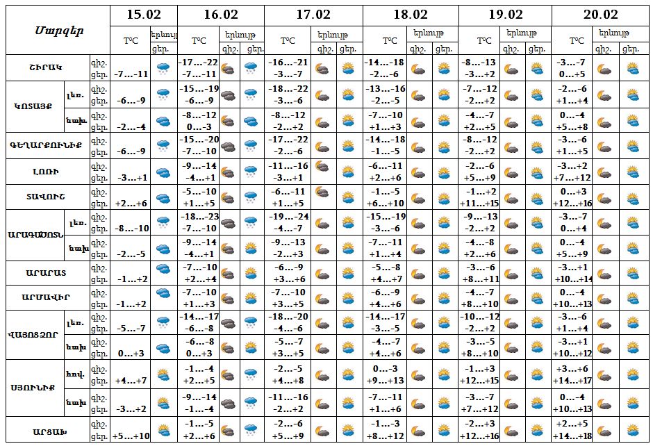 Փետրվարի 15-ի ցերեկը, 16-ին առանձին շրջաններում սպասվում է թույլ ձյուն, լեռնային գոտիներում՝ բուք։ Փետրվարի 17-20-ը սպասվում է առանց տեղումների եղանակ: