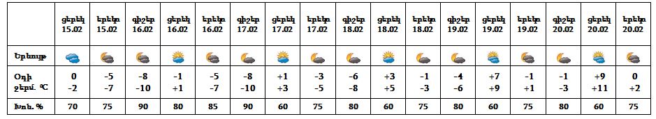 Փետրվարի 15-ի ցերեկը, 16-ին քաղաքի առանձին հատվածներում հնարավոր է թույլ ձյուն։ Փետրվարի 16-ին սպասվում է նաև քամու ուժգնացում` 10-12 մ/վ: Փետրվարի 17-20-ը սպասվում է առանց տեղումների եղանակ։