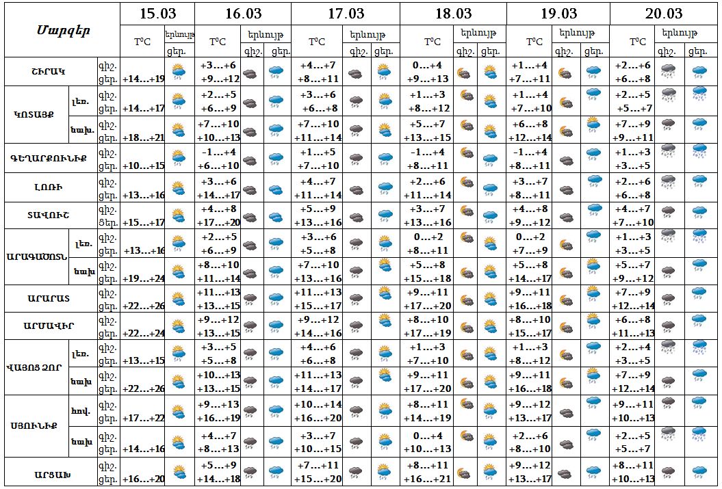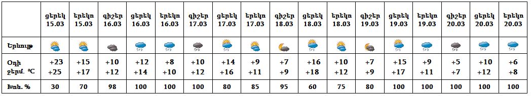 Մարտի 15-ի ցերեկը, 17-18-ը, 19-ի գիշերը սպասվում է առանց տեղումների եղանակ: Մարտի 16-ին, 17-ի գիշերը, 19-20-ը սպասվում է անձրև։ Մարտի 17-ի ցերեկը, 18-ին հնարավոր է կարճատև անձրև: