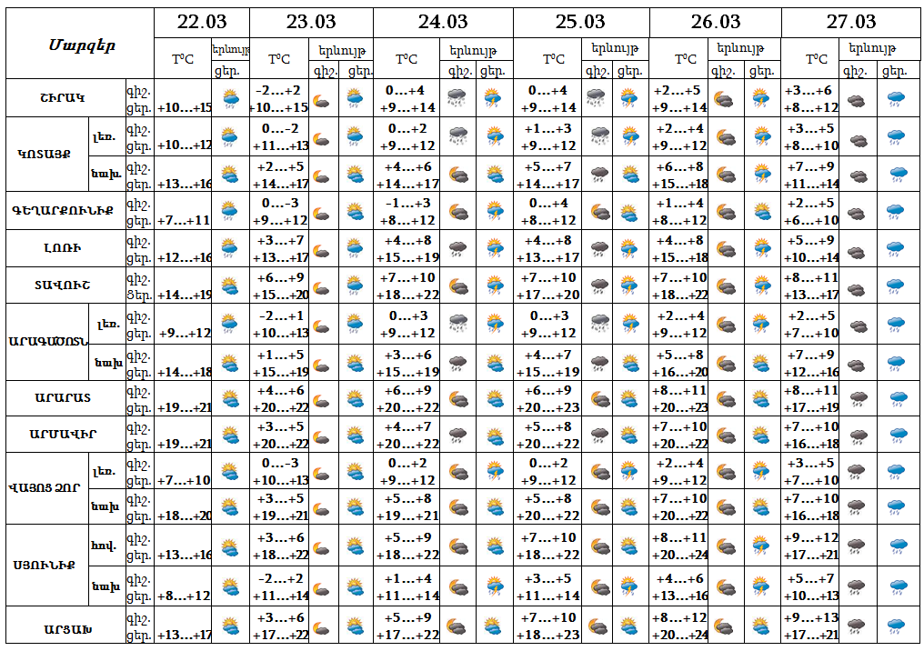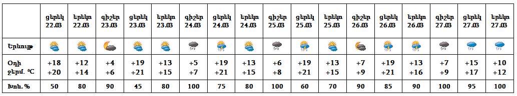 Մարտի 22-24-ն օդի ջերմաստիճանն աստիճանաբար կբարձրանա 3-5 աստիճանով, Լոռիում, Տավուշում, Սյունիքում և Արցախում՝ 6-8 աստիճանով: