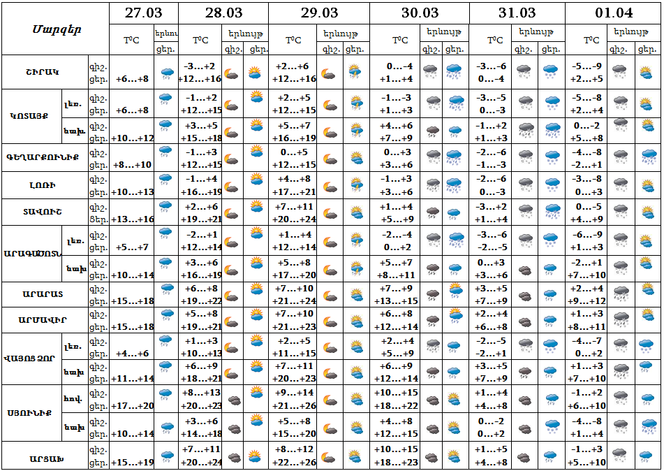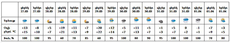 Մարտի 27-ի ցերեկը և 30-31-ը, ապրիլի 1-ի գիշերը շրջանների զգալի մասում, 29-ի ցերեկն առանձին շրջաններում սպասվում են տեղումներ, 30-ին լեռնային, 31-ին լեռնային և նախալեռնային շրջաններում` ձյան տեսքով։ Առանձին հատվածներում՝ մառախուղ, հնարավոր է նաև ամպրոպ: Մարտի 28-ին սպասվում է առանց տեղումների եղանակ: