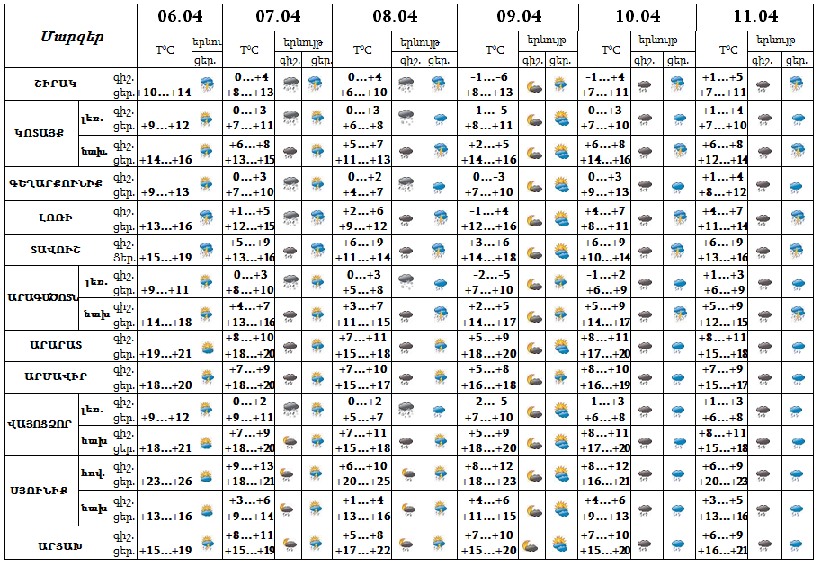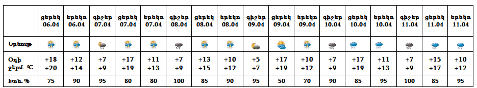 Ապրիլի 6-ի ցերեկը, 7-ին, 9-ի ուշ երեկոյան, սպասվում է կարճատև անձրև և ամպրոպ։ 8-ին, 10-11-ը ժամանակ առ ժամանակ սպասվում է անձրև: Ապրիլի 9-ի գիշերը սպասվում է առանց տեղումների եղանակ։