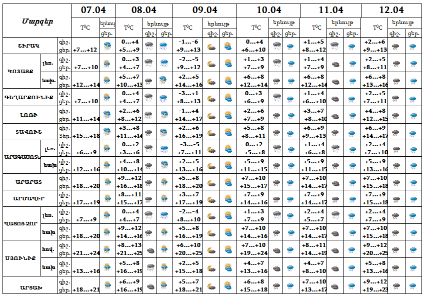 Ապրիլի 7-ի ցերեկը, 8-ին, 10-12-ը շրջանների զգալի մասում սպասվում են տեղումներ, 7-8-ը հնարավոր է նաև ամպրոպ։ Ապրիլի 9-ին սպասվում է առանց տեղումների եղանակ։