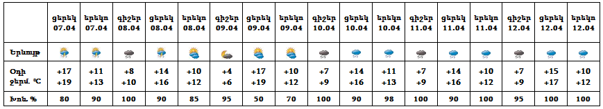 Ապրիլի 7-ի ցերեկը սպասվում է կարճատև անձրև և ամպրոպ։ Ապրիլի 8-ին, 10-12-ը ժամանակ առ ժամանակ սպասվում է անձրև: Ապրիլի 9-ին սպասվում է առանց տեղումների եղանակ։