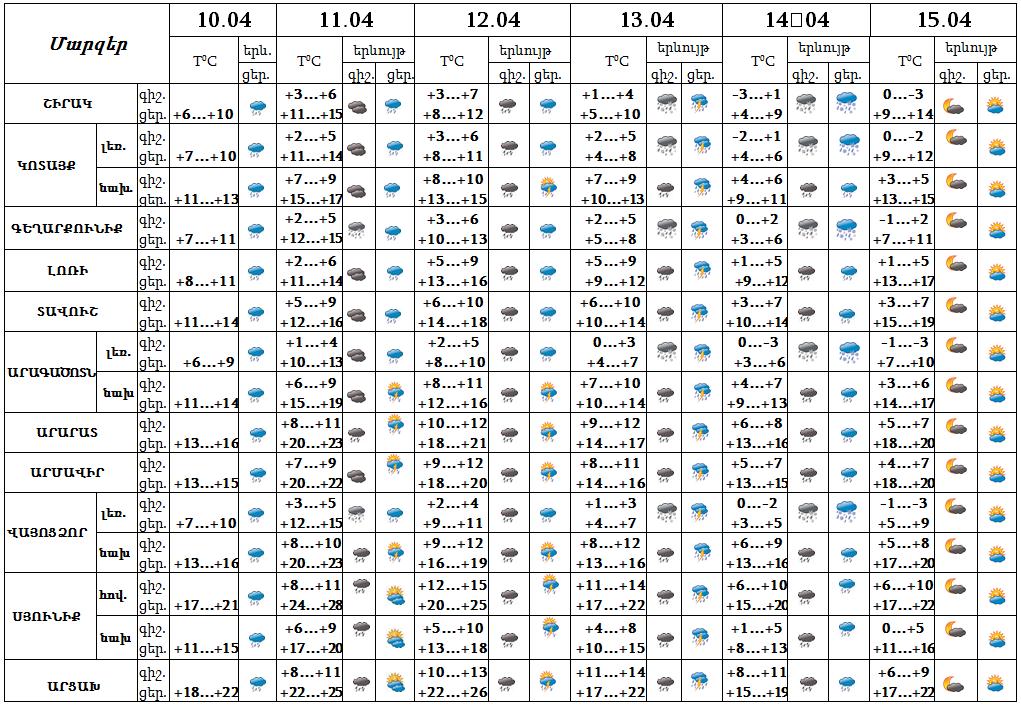 Ապրիլի 10-ի ցերեկը, 11-14-ը շրջանների զգալի մասում սպասվում են տեղումներ, առանձին վայրերում 11-13-ը հնարավոր է նաև ամպրոպ։ Ապրիլի 15-ին սպասվում է առանց տեղումների եղանակ։