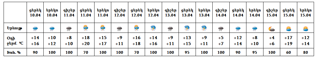 Ապրիլի 10-ի ցերեկը, 11-14-ը ժամանակ առ ժամանակ սպասվում է անձրև, հնարավոր է նաև ամպրոպ: Ամպրոպի ժամանակ սպասվում է քամու ուժգնացում` 14-17 մ/վ արագությամբ։ Ապրիլի 15-ին սպասվում է առանց տեղումների եղանակ։