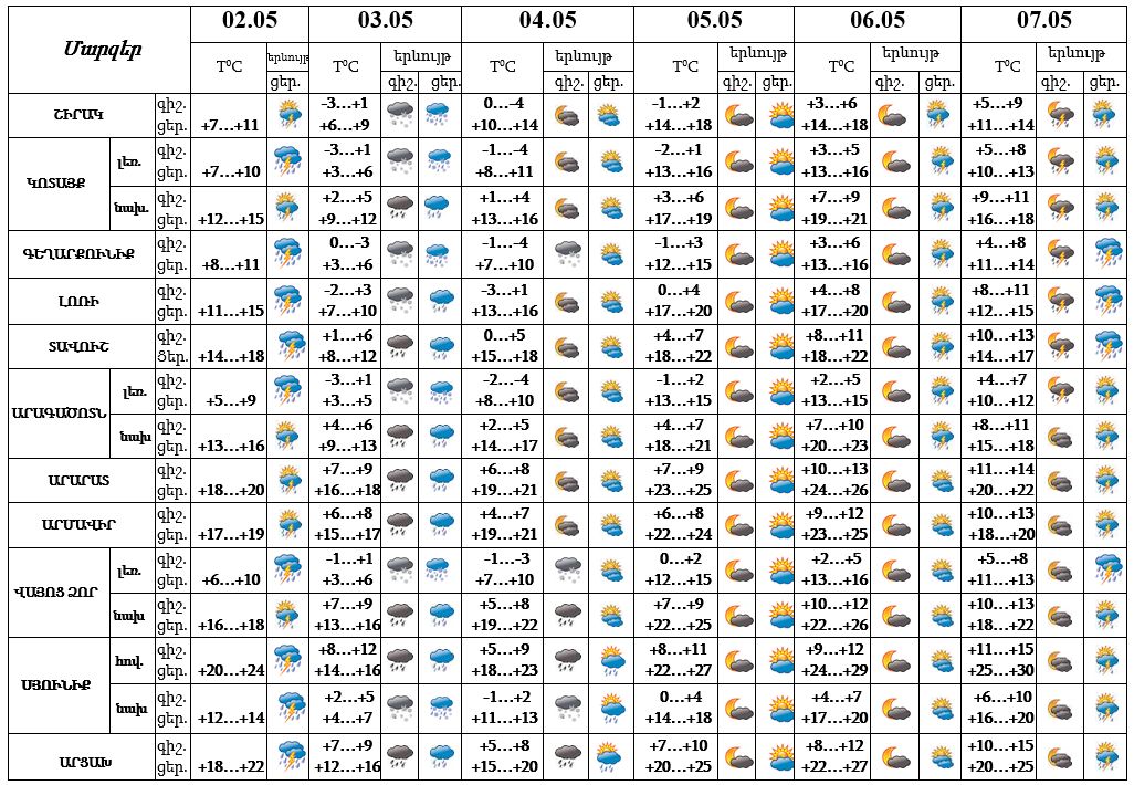 Օդի ջերմաստիճանը մայիսի 3-ի ցերեկը կնվազի 3-6 աստիճանով, 4-ի ցերեկը, 5-6-ն աստիճանաբար կբարձրանա 6-8 աստիճանով։