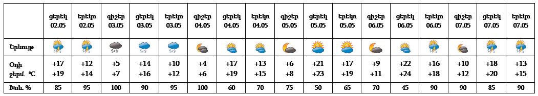Մայիսի 2-ի կեսօրից հետո, 3-ին, 6-ի երեկոյան ժամերին, 7-ին սպասվում է անձրև և ամպրոպ։ Ամպրոպի ժամանակ՝ քամու ուժգնացում՝ 13-16 մ/վ արագությամբ։ Մայիսի 4-5-ը, 6-ի գիշերը սպասվում է առանց տեղումների եղանակ։