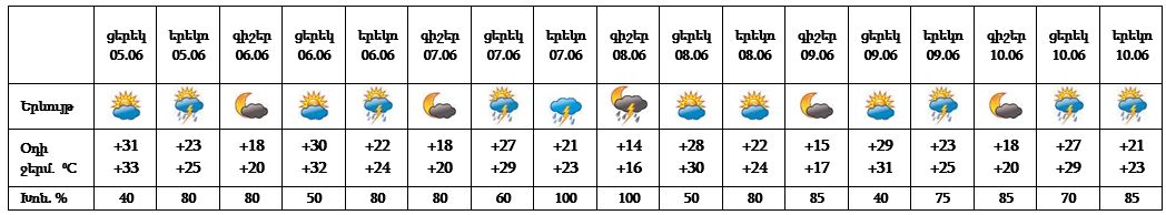 Հունիսի 5-ին, 8-9-ն առանձին շրջաններում, 6-7-ն, 10-ին շրջանների զգալի մասում սպասվում է կարճատև անձրև և ամպրոպ, առանձին հատվածներում հնարավոր է կարկուտ։ Հունիսի 5-ին, 6-ին, 9-10-ը տեղումները կլինեն կեսօրից հետո, իսկ 7-8-ի գիշերը և կեսօից հետո։