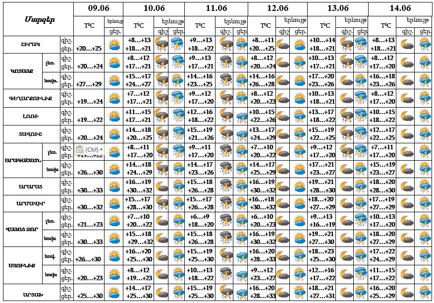 Հունիսի 9-ի և 12-ի երեկոյան ժամերին քաղաքի առանձին հատվածներում հնարավոր է, 10-11-ը, 13-14-ը սպասվում է կարճատև անձրև և ամպրոպ։ Ամպրոպի ժամանակ՝ քամու ուժգնացում՝ 13-16 մ/վ արագությամբ։